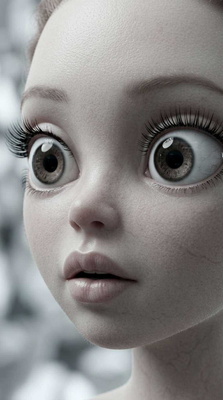 Strong rule: style --- Cyberpunk ---. Экстремально крупный план лица Карлы. Ее глаза широко открыты, зрачки расширены. Губы едва заметно ...