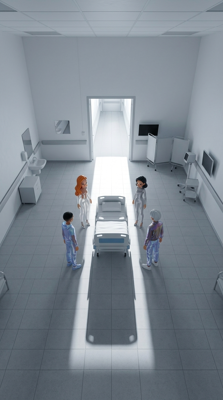 Strong rule: style --- Глянцевый кинематографичный ---. Широкий план больничной палаты сверху вниз. Четыре фигуры образуют композицию во...