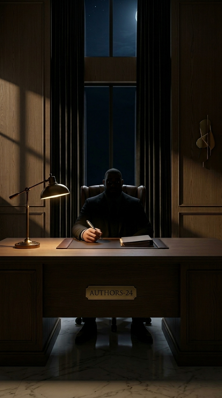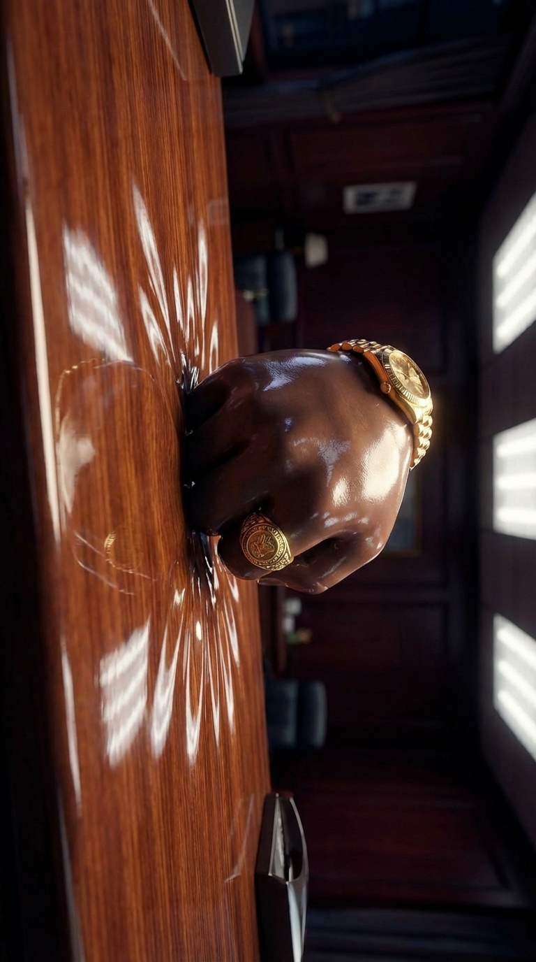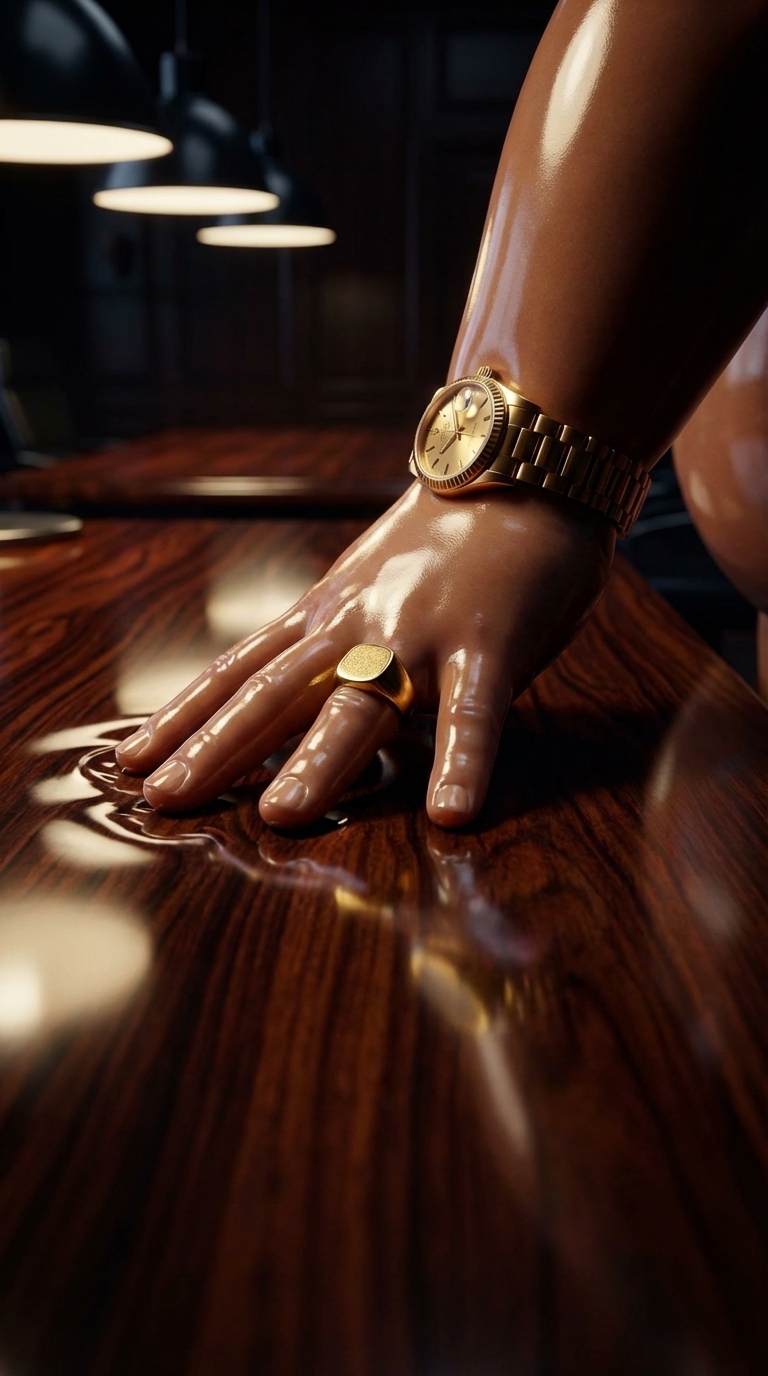 Strong rule: style --- Глянцевый кинематографичный ---. Экстремально крупный план руки директора, резко опускающейся на полированную пов...