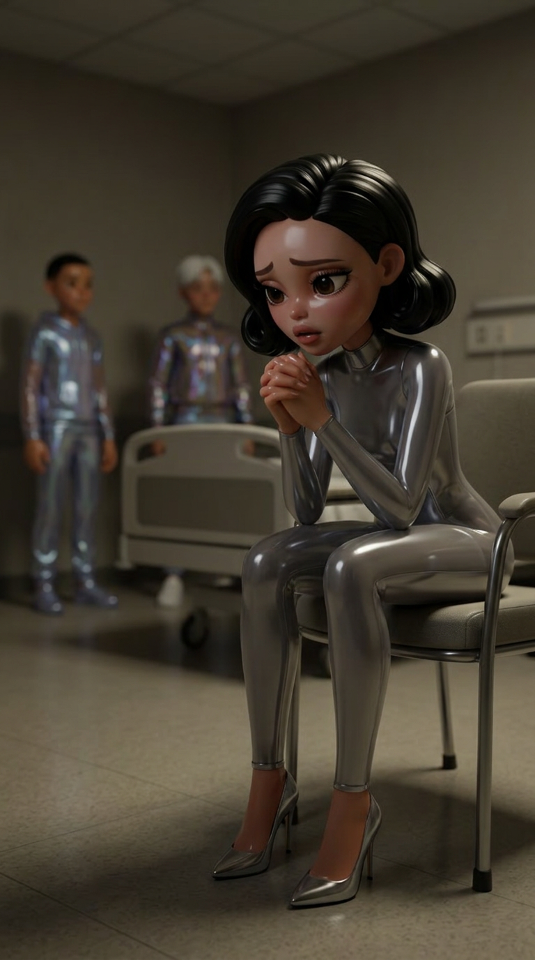 Strong rule: style --- Глянцевый кинематографичный ---. Средний план Марины, сидящей на краю стула в больничной палате. Она сжимает руки...