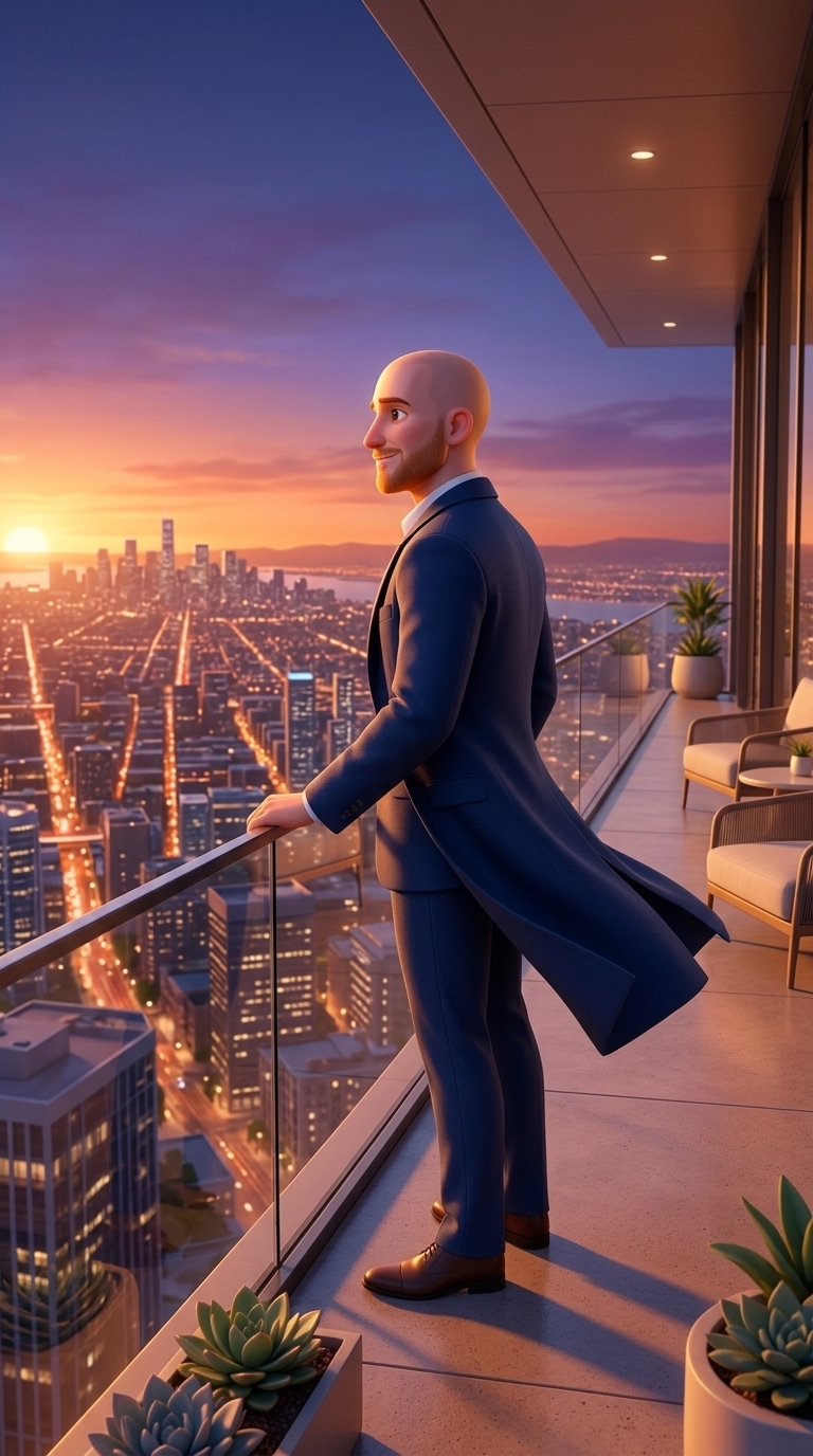 Strong rule: style --- 3D Pixar ---. Герман стоит на открытой террасе небоскреба на закате. Он смотрит на современный город, который гарм...