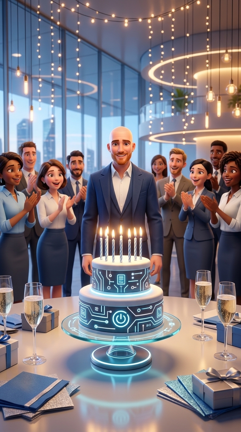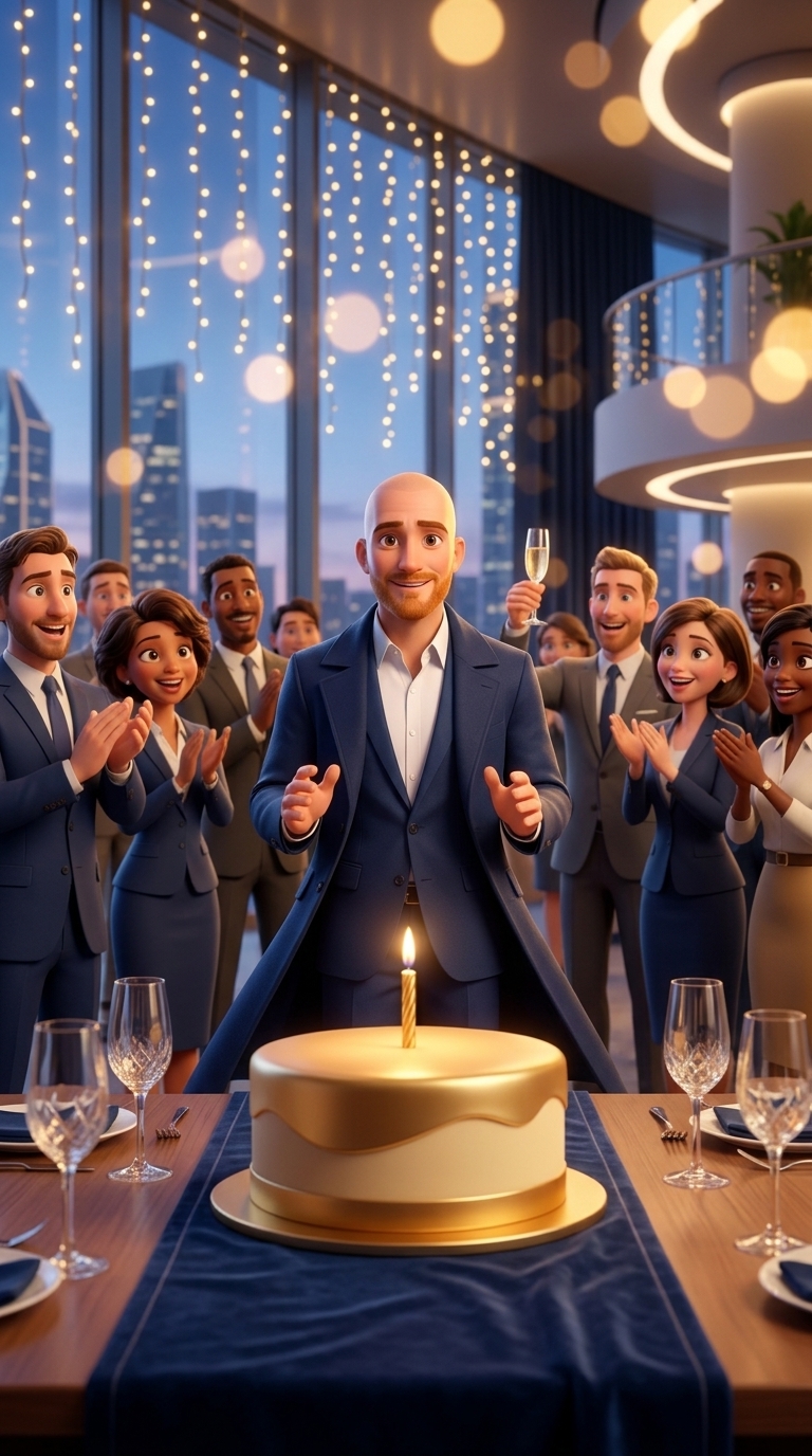 Strong rule: style --- 3D Pixar ---. Праздничная, но элегантная обстановка в современном офисе. На столе стоит стильный торт с одной горя...