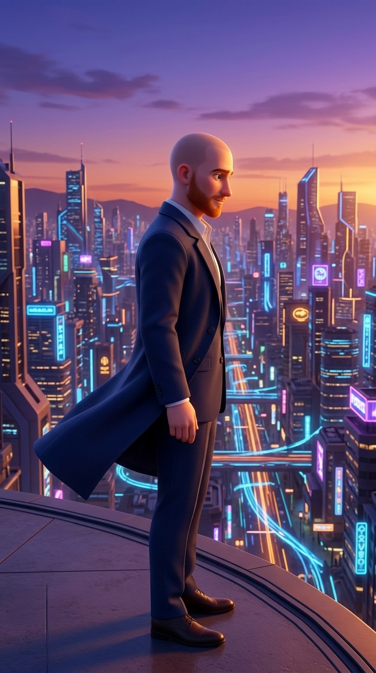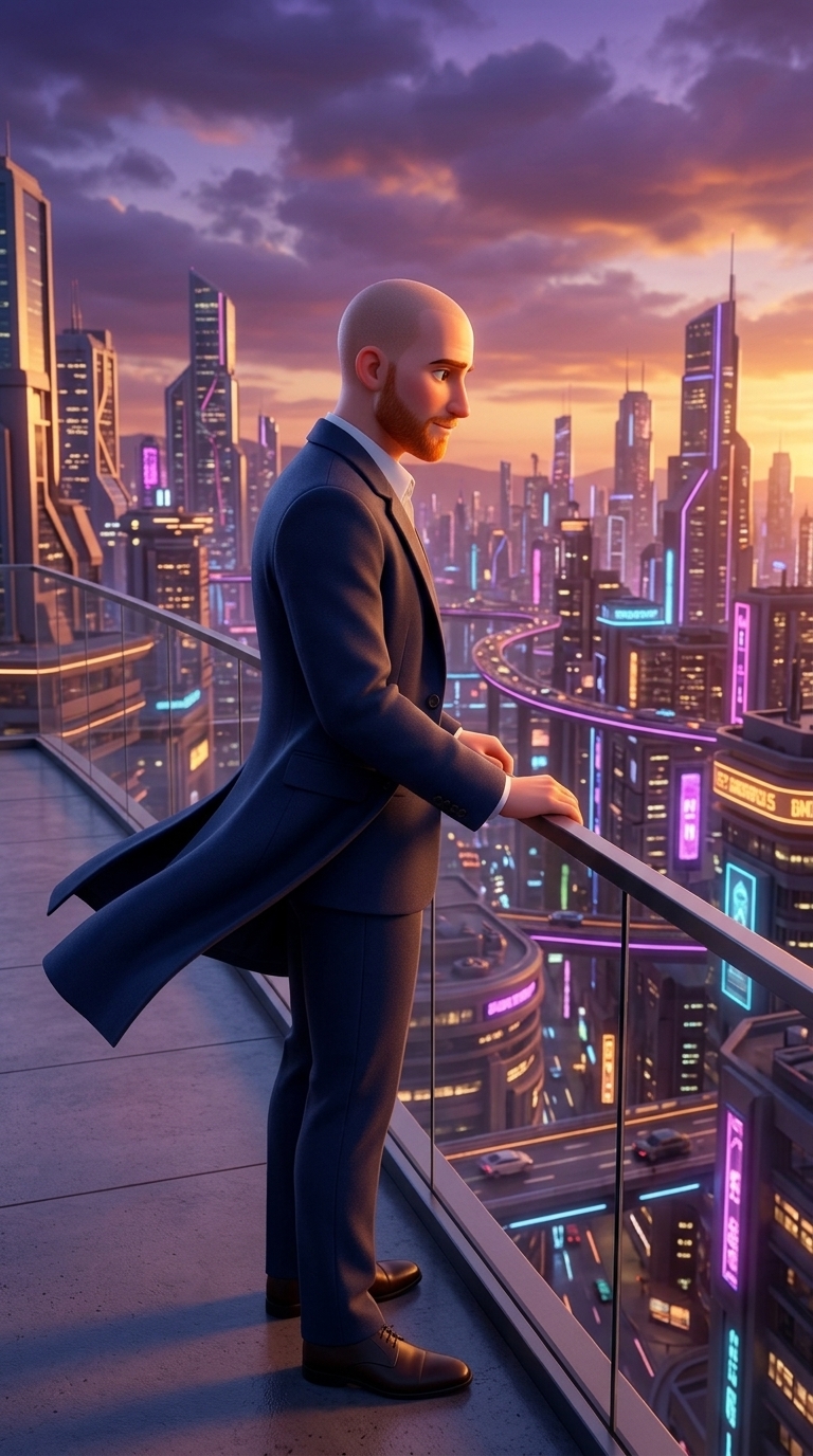 Strong rule: style --- 3D Pixar ---. Герман стоит на открытой террасе небоскреба на закате. Он смотрит на современный город в стиле кибер...