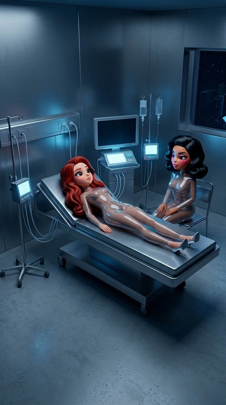 Strong rule: style --- Cyberpunk ---. Интерьер современной реанимации в глубоких синих и стальных тонах. Карла лежит на белой кровати, ок...