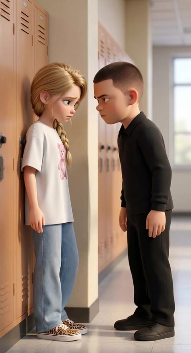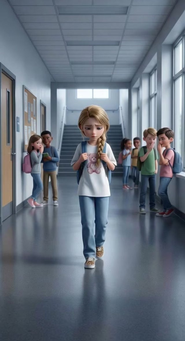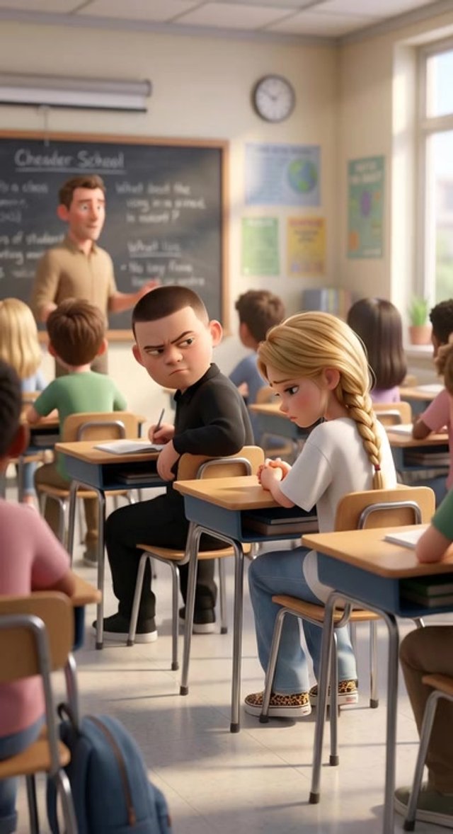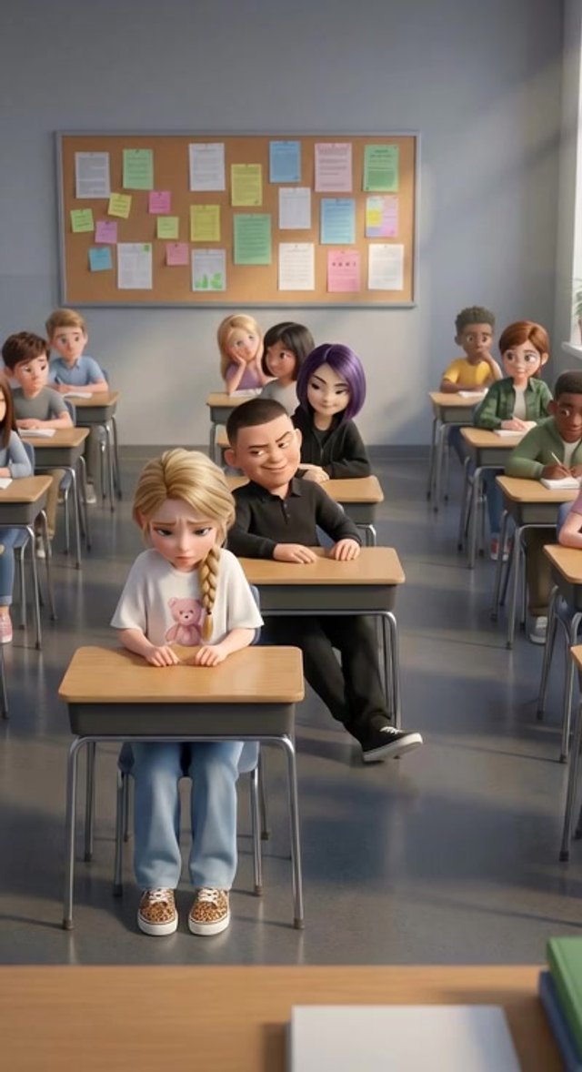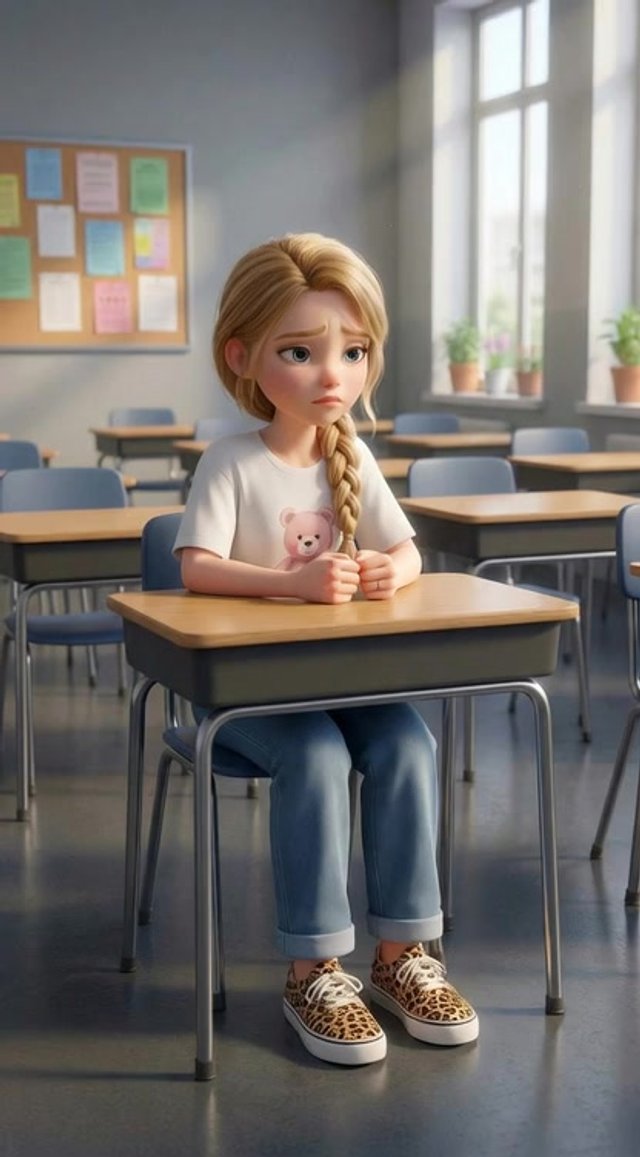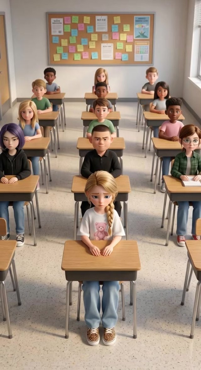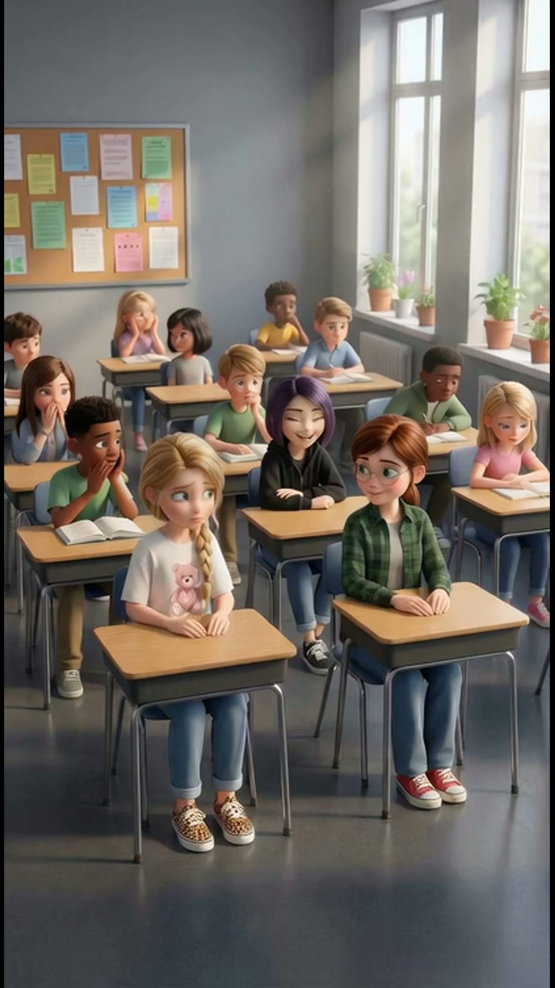 Вика громко произносит свои слова, размахивая руками, чтобы привлечь внимание всего класса. Мира мгновенно сжимается, ее плечи опускаются...