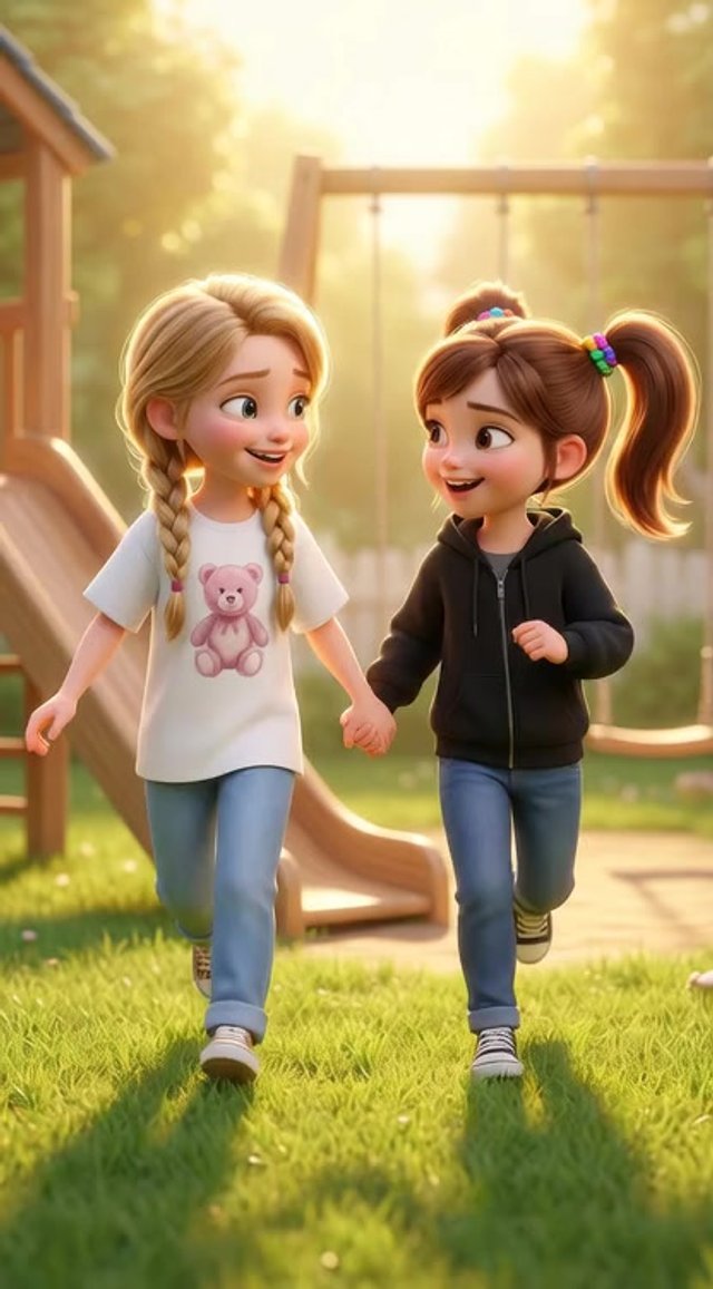 Мира говорит закадровым голосом. Девочки бегут по площадке, держась за руки, улыбаясь и смеясь. У маленькой Миры две костяки колосок. У м...