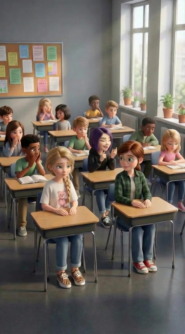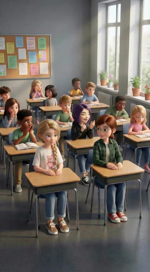 Вика, девочка с фиолетовыми волосами, сидит за Мирой, громко произносит свои слова, чтобы привлечь внимание всего класса. Мира, девочка...