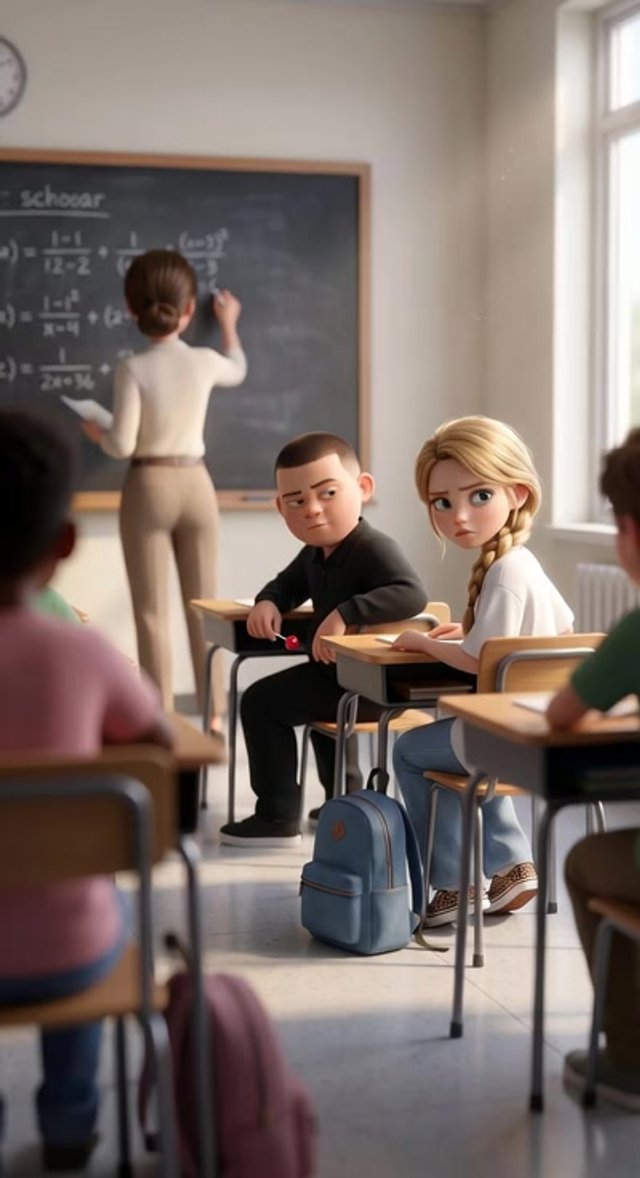 Идет урок. Учитель пишет что-то на доске объясняя тему. Марки сидит ближе к доске, за ним Мира. Марк то и делает что достает из под парты...