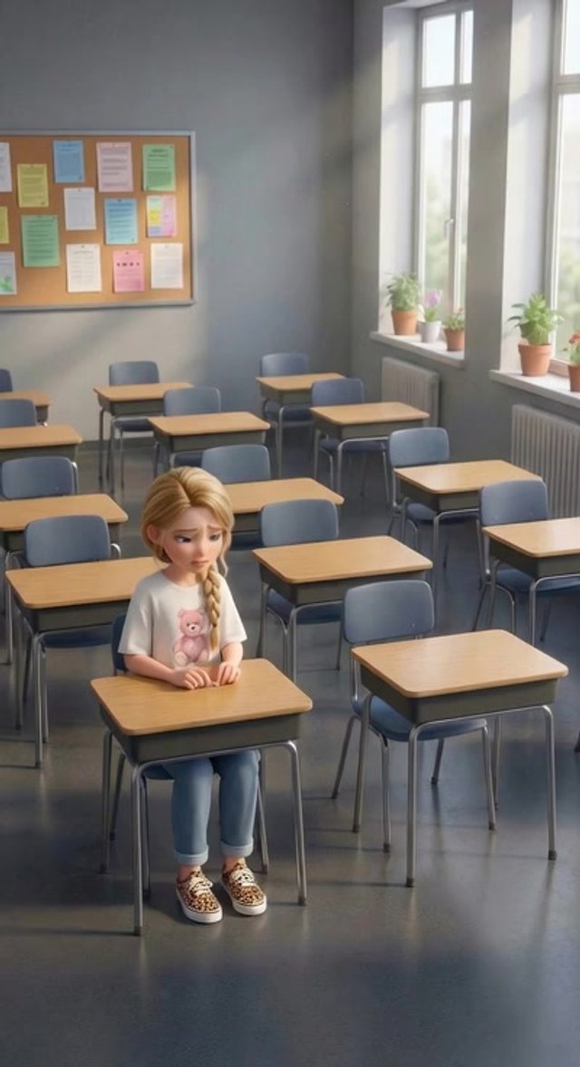 Мира сидит одна в классе, камера идет вокруг грустного ее лица, глаза опущены вниз ASMR sound design: emphasize ambient sounds, texture...