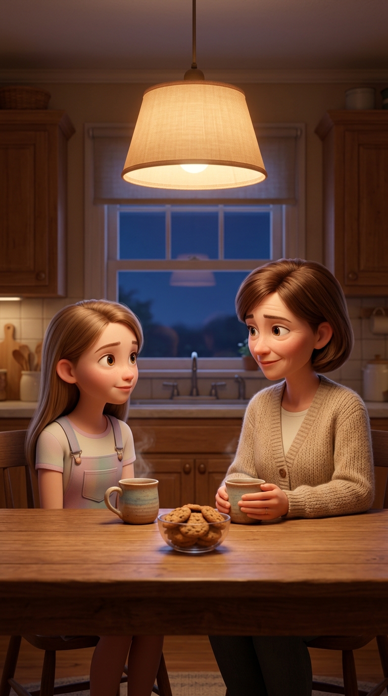 Мама мягко улыбается и пододвигает чашку чая к Мире, ее движения плавные и спокойные. Мира медленно поднимает глаза от стола, на ее лице ...