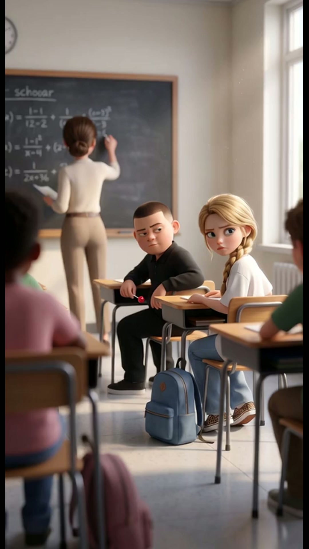 Идет урок. Учитель пишет что-то на доске объясняя тему. Марк сидит ближе к доске, за ним Мира. Марк прячет под партой красный чупа чупс, ...