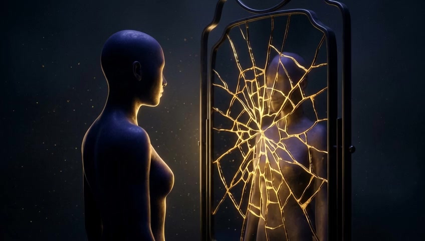 The camera pushes into the mirror, which acts as a window into the silhouette's inner world, focusing on the pulsating golden cracks. No...