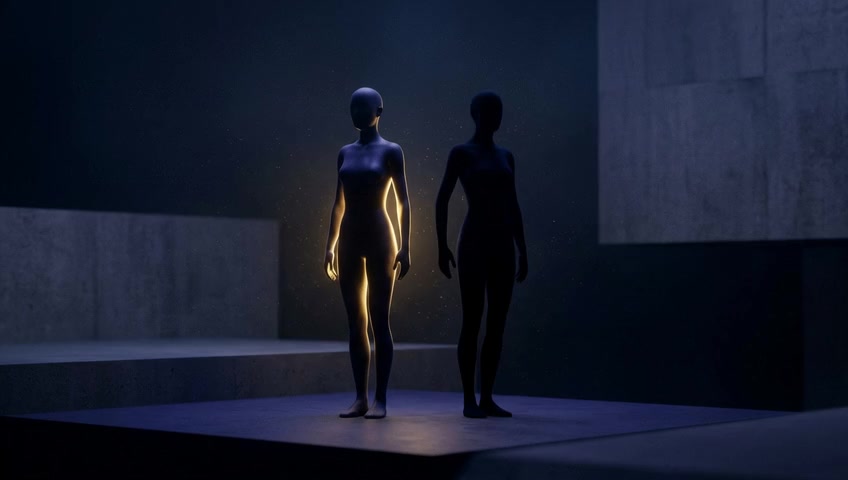 A smooth animation shows the shadow peeling off the floor and rising to stand beside the main figure. The movement is fluid and surreal. ...