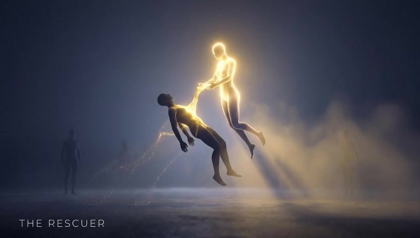 The rescuer silhouette's light visibly drains away and flows into the dark figure, which begins to glow faintly. A visual metaphor for se...