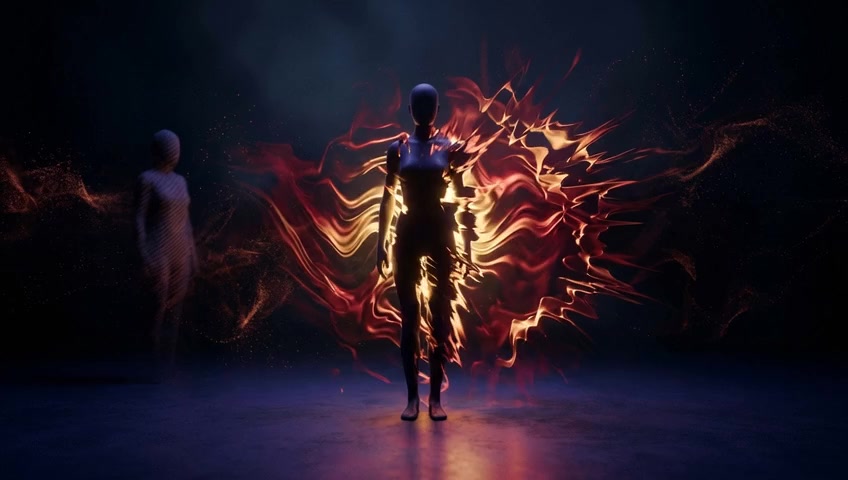 The cold figure walks away smoothly. The camera stays with the reaching figure, focusing on the emotional gesture of its outstretched han...