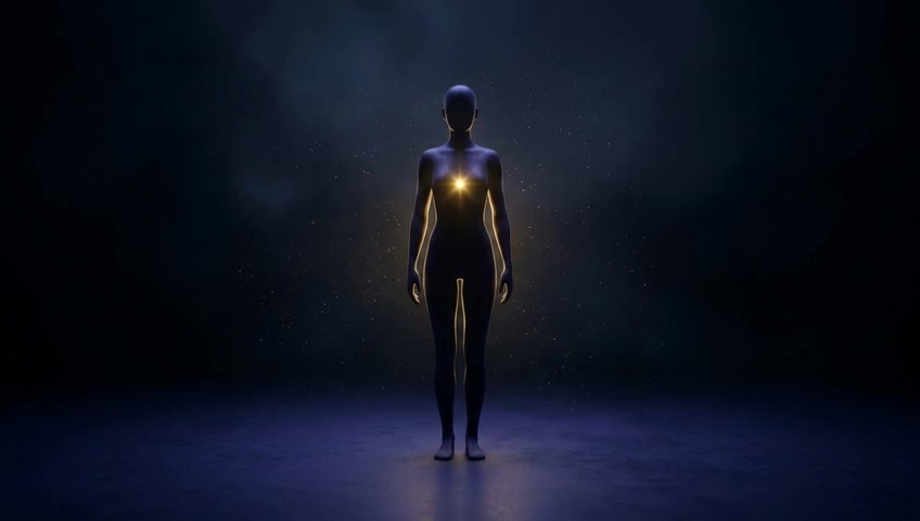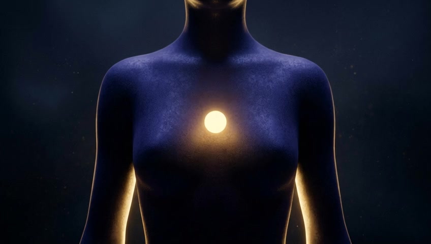 The camera holds a tight shot on the chest, the soft, constant light creating a feeling of inner peace and stability. No background music.