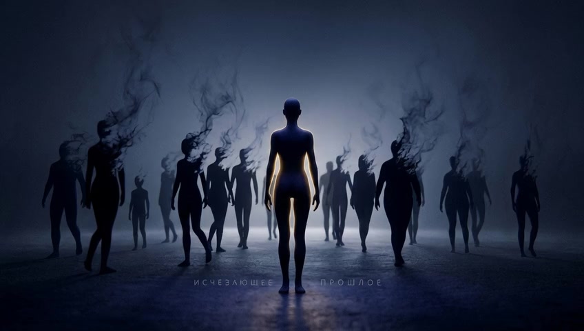 A wide shot showing the silhouette in the foreground looking ahead, with the symbols of its past fading away in the background. A sense o...