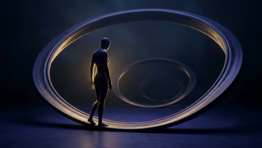 The camera is positioned behind the silhouette, looking forward down the new path. The old, dimming circle is visible behind it, in the p...