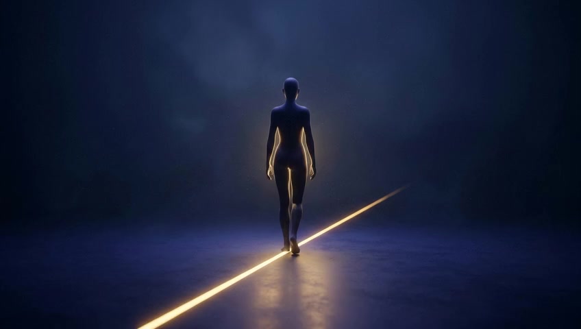 The golden line animates, extending forward into the darkness as the silhouette prepares to walk. It represents an unknown but linear fut...