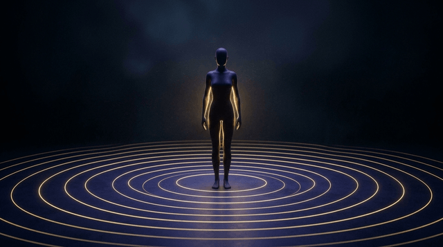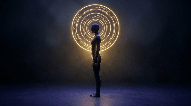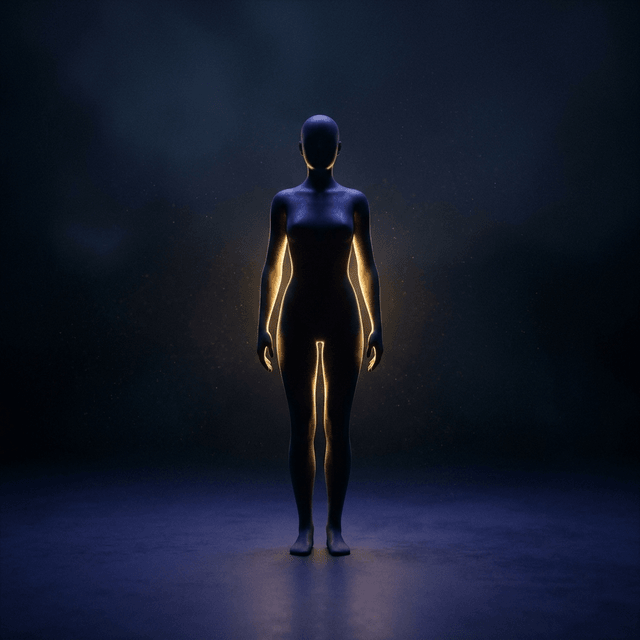 A calm, centered close-up shot of the silhouette. Soft, golden rings of ligh...