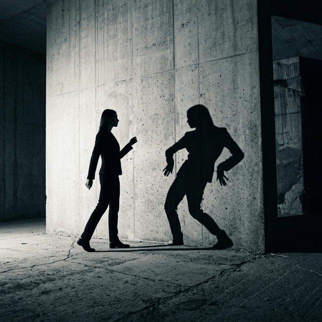 Strong rule: style --- cinematic, minimalist, abstract, conceptual art ---. A shadow that is nearly identical to the Main Silhouette but ...