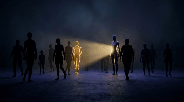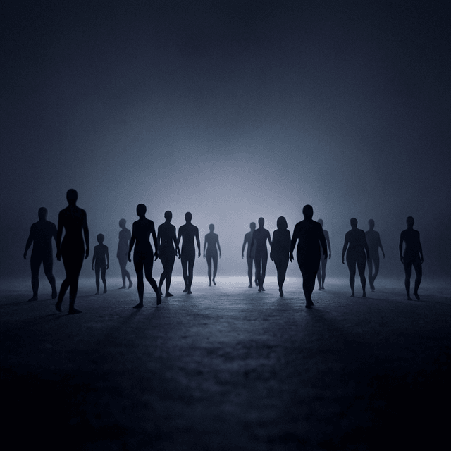 The main silhouette watches as other silhouettes pass by. Most of them are r...