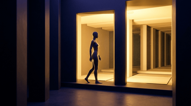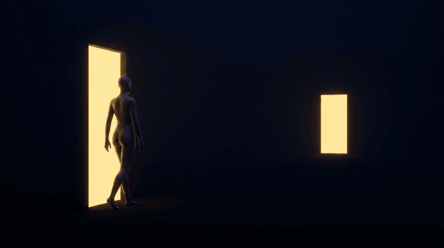 A dark, minimalist space. In the center is a single, abstract object resembl...