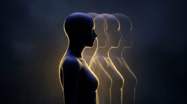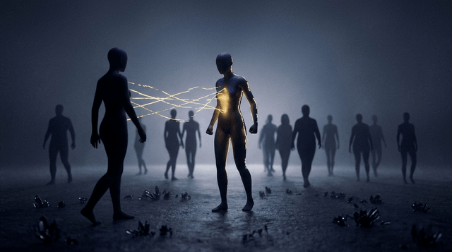 Strong rule: style --- cinematic, minimalist, abstract, conceptual art ---. An androgynous, featureless human silhouette made of deep, da...