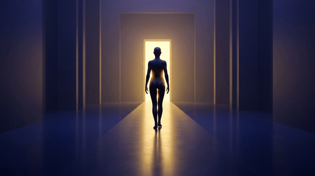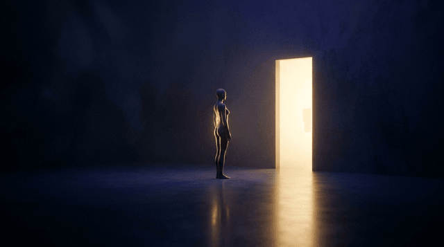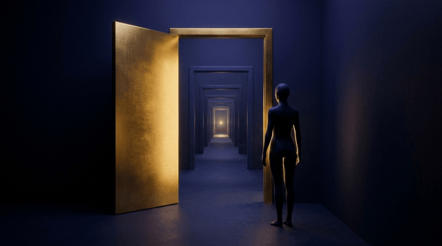 Cinematic shot of the golden door swinging open silently. Through the doorwa...