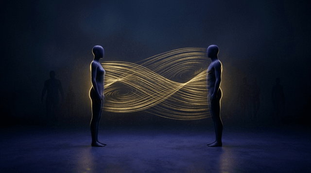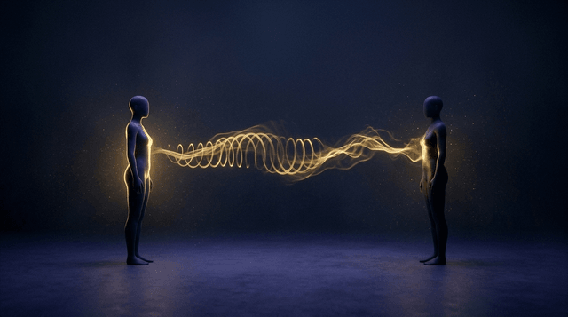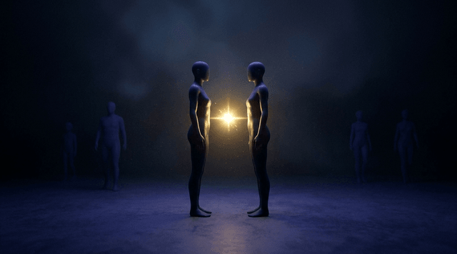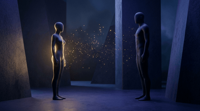 Two silhouettes are shown. A brief, intense pulse of golden light flashes be...