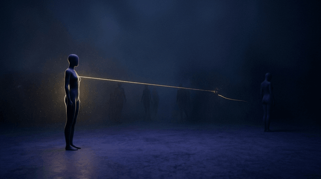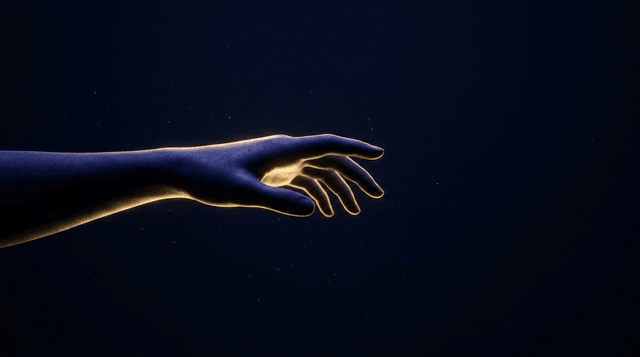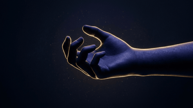 Symbolic close-up shot. A single, elegant silhouette hand reaches out into t...