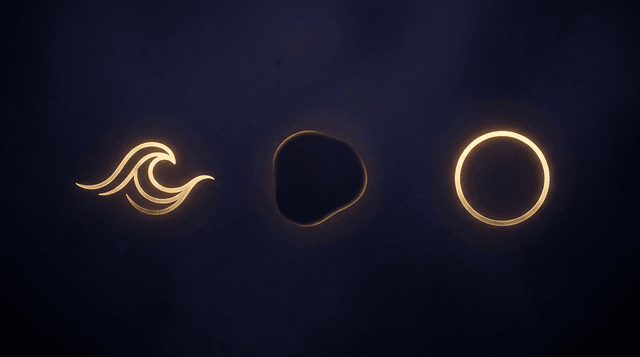 Abstract dark indigo background. Three minimalist, symbolic icons materializ...