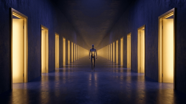 A beautiful but unsettling shot of a long corridor lined with countless iden...