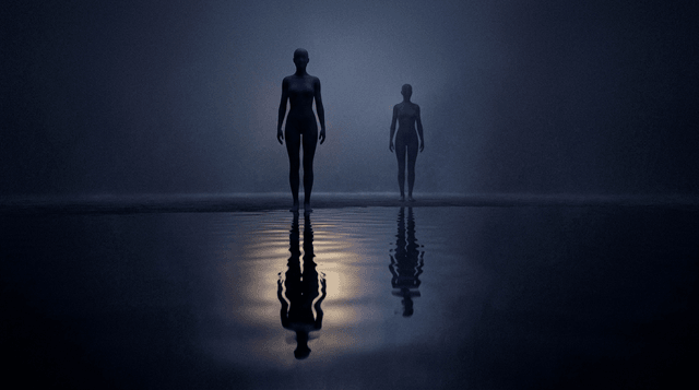The silhouette stands before a large, dark mirror. Its reflection is almost ...