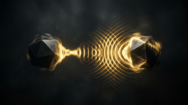 Abstract waves of golden energy travel through a dark space populated by sev...