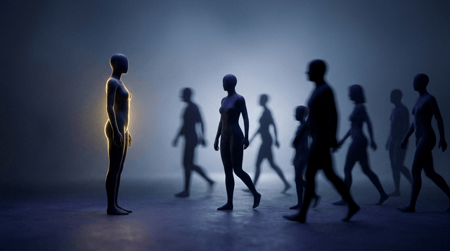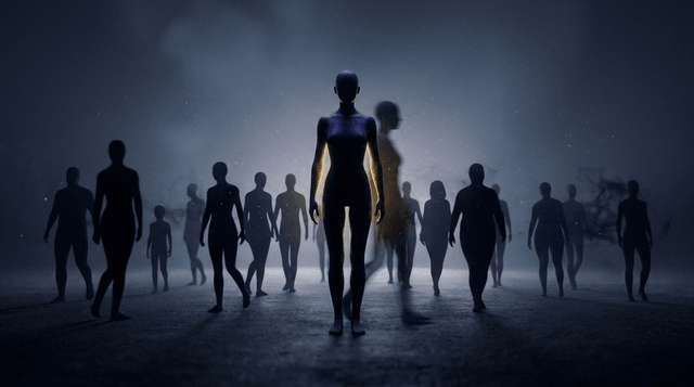 Strong rule: style --- cinematic, minimalist, abstract, conceptual art ---. Featureless human silhouettes of varying shapes and sizes, ma...