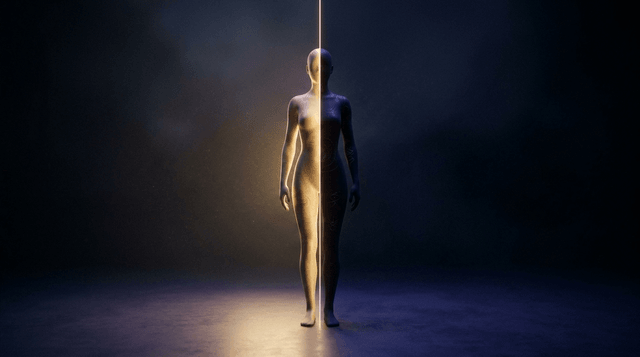 A silhouette is bisected by a line of light. One half is in deep shadow, the...