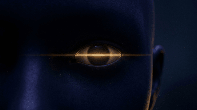 Extreme close-up on the eye of a silhouette in semi-darkness. A thin, horizo...