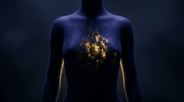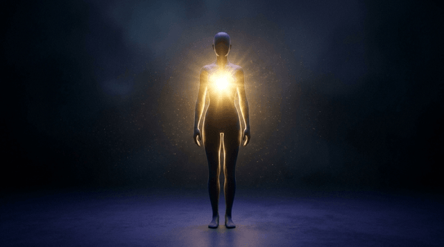 Close-up on the chest area of the main silhouette. A faint, golden light ins...