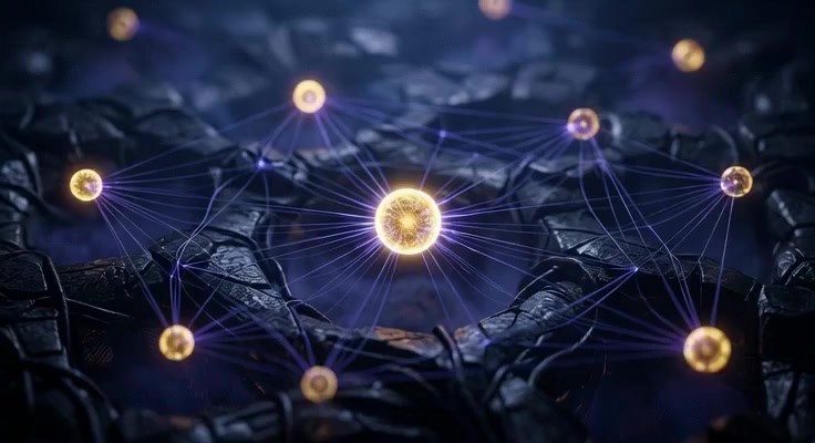 Плавный наезд камеры на центральную точку, в то время как энергетические связи вокруг нее медленно проявляются и становятся ярче.