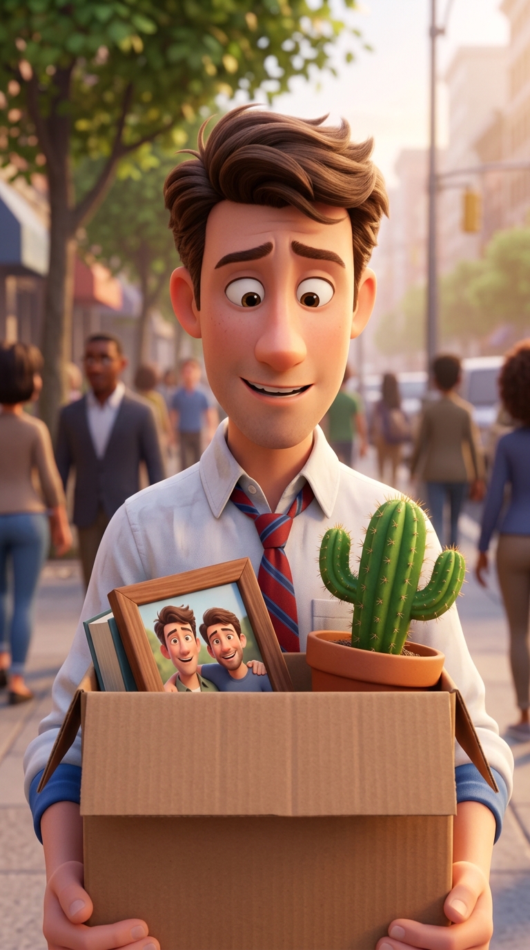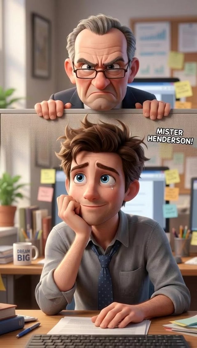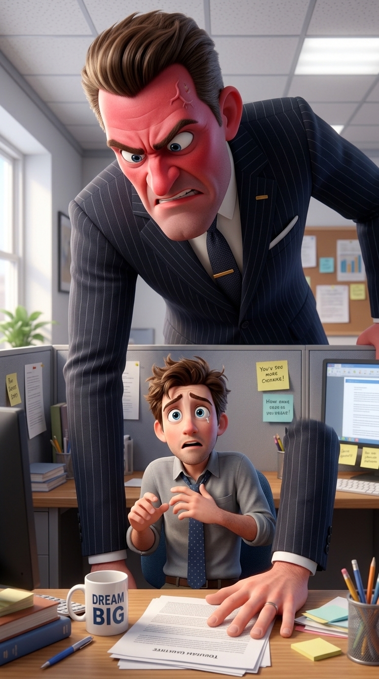 Pixar style 3D animation, a tall, angry boss with a red face and a sharp suit looming over a small cubicle. Kevin, ...