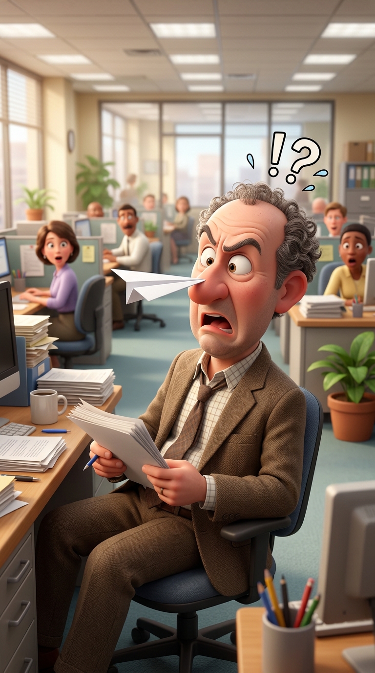 бумажный Самолетик пролетает прямо перед носом Мистера Хендерсона . сцена происходит в офисе Его лицо выражает коми...