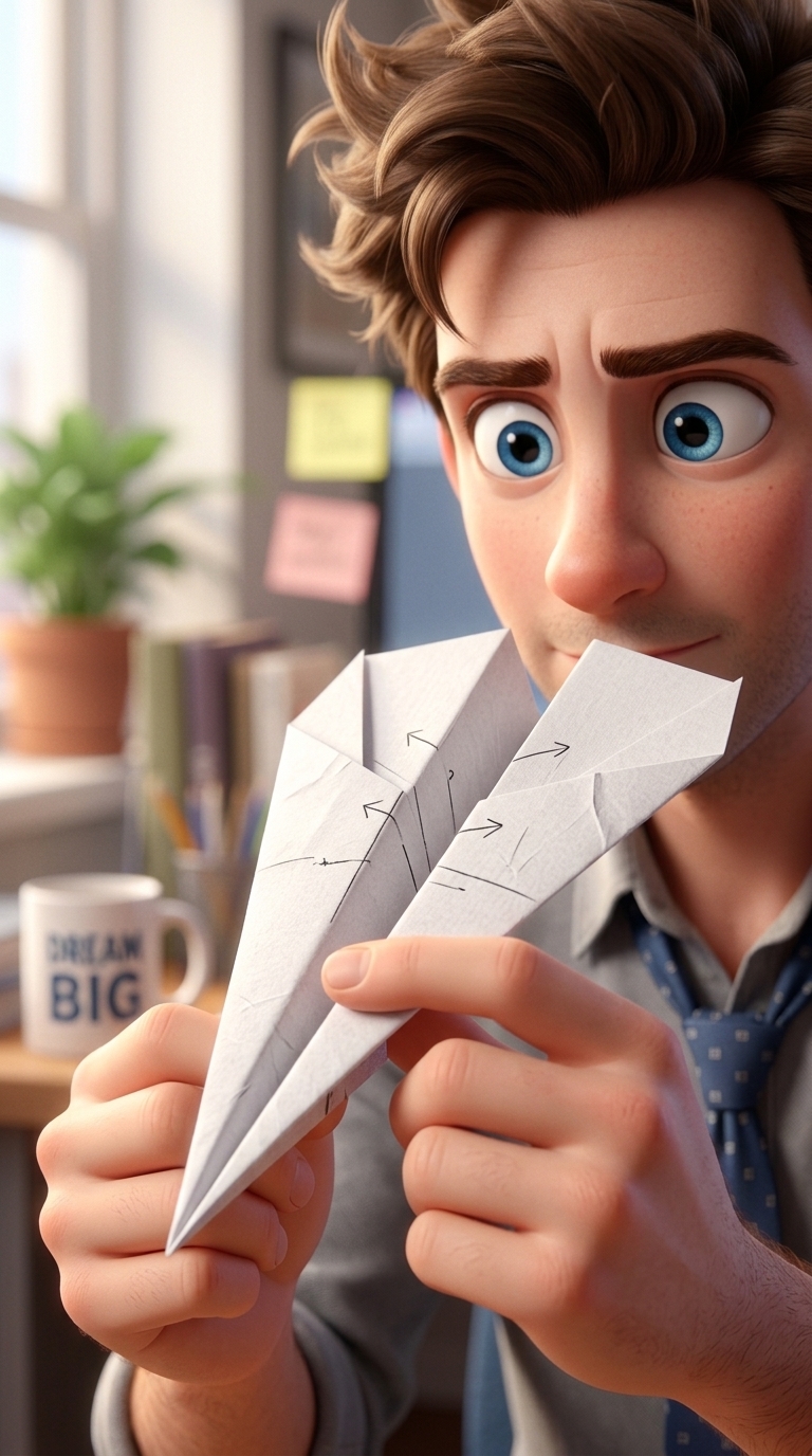 Кевин решительно смотрит на бумажный самолетик. Он берет его в руки. Крупный план его рук и самолетика. Детализиров...