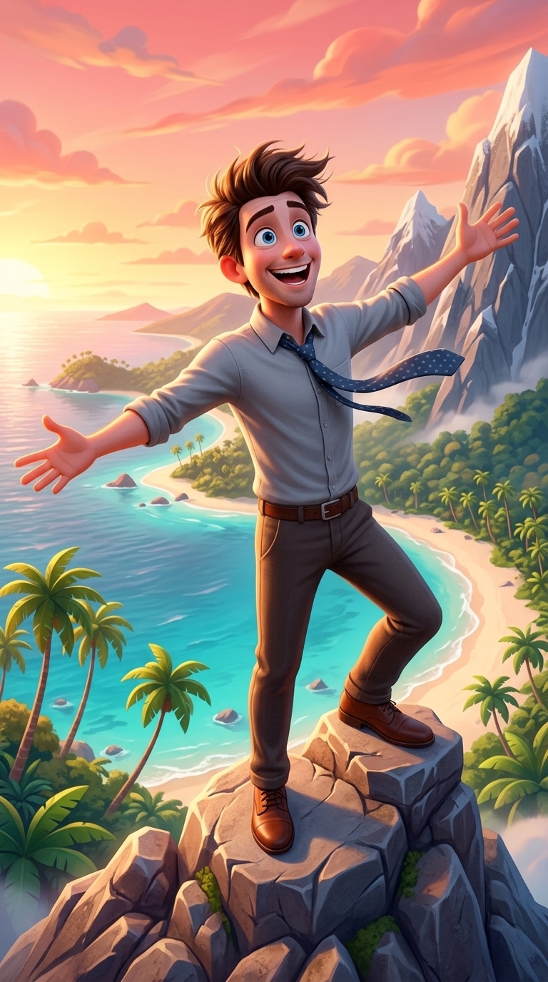 Мечта Кевина: он стоит на вершине горы, ветер развевает его волосы. Фон меняется на тропический пляж с пальмами. Яр...