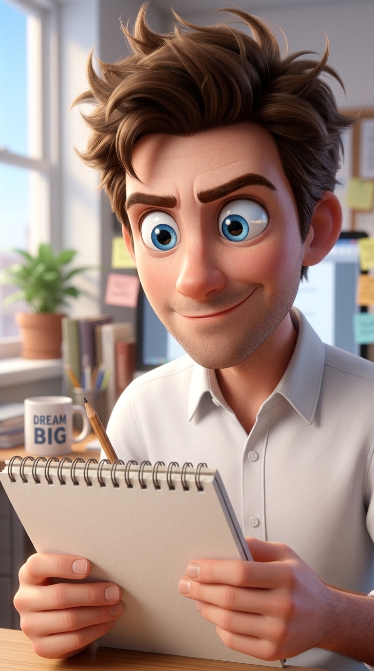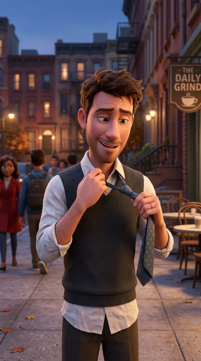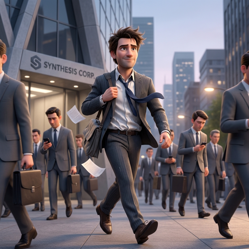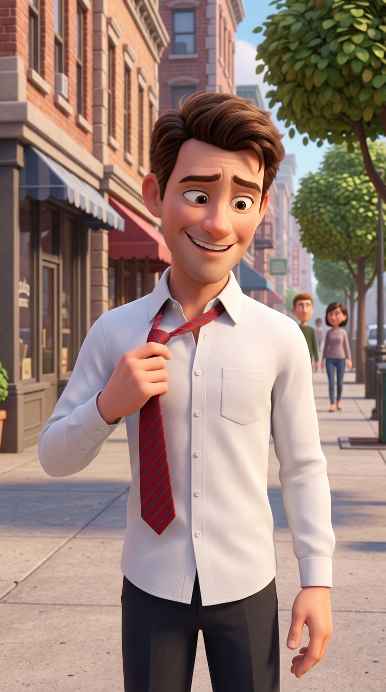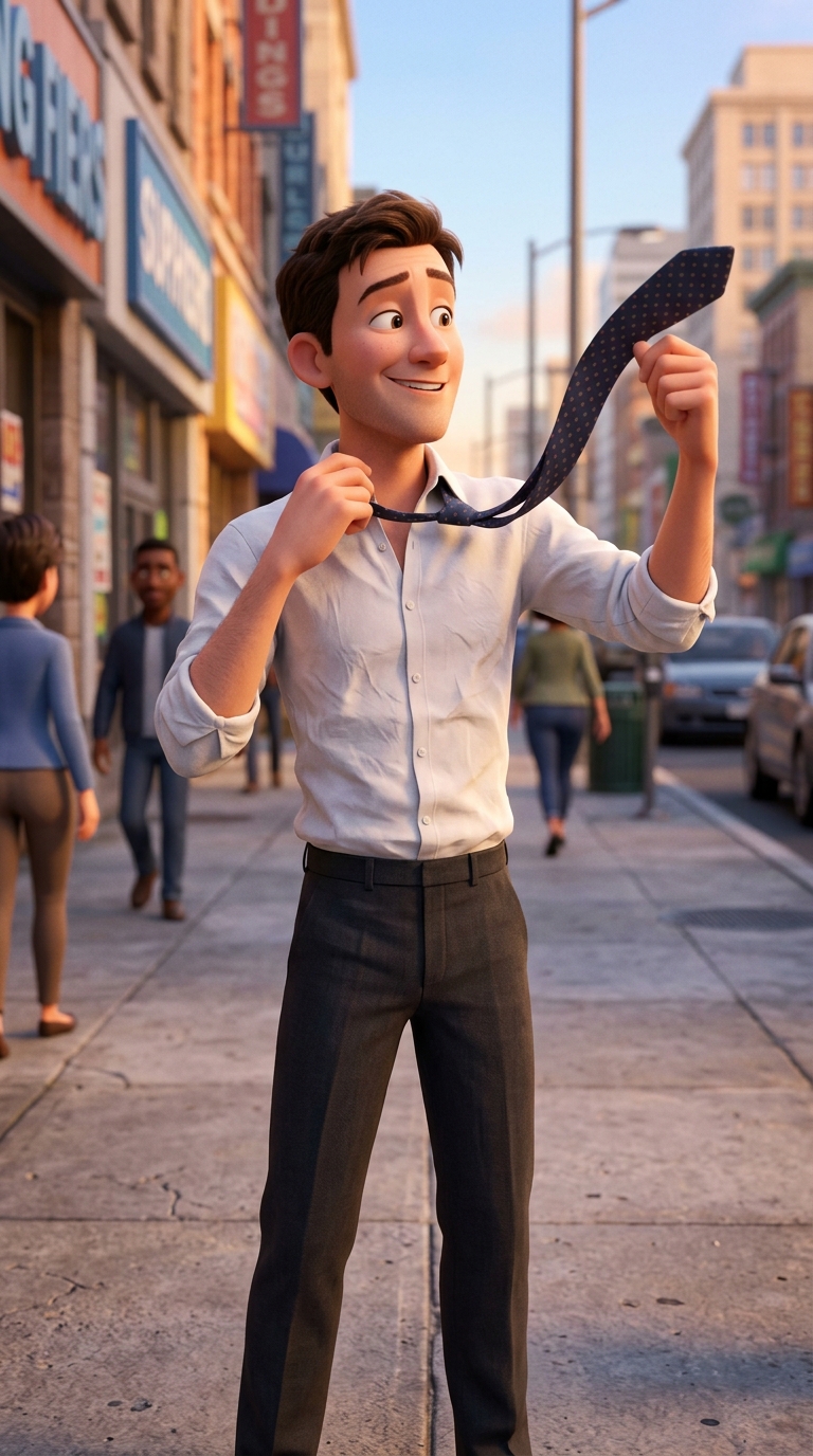 Strong rule: style --- Современный 3D-анимационный стиль, похожий на P... ---. Мужчина, 30-35 лет, в строгом сером офисном костюме, но с ...