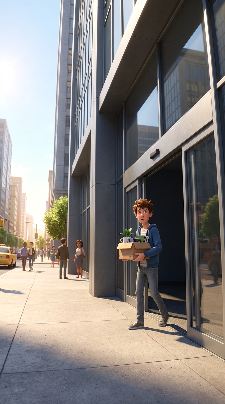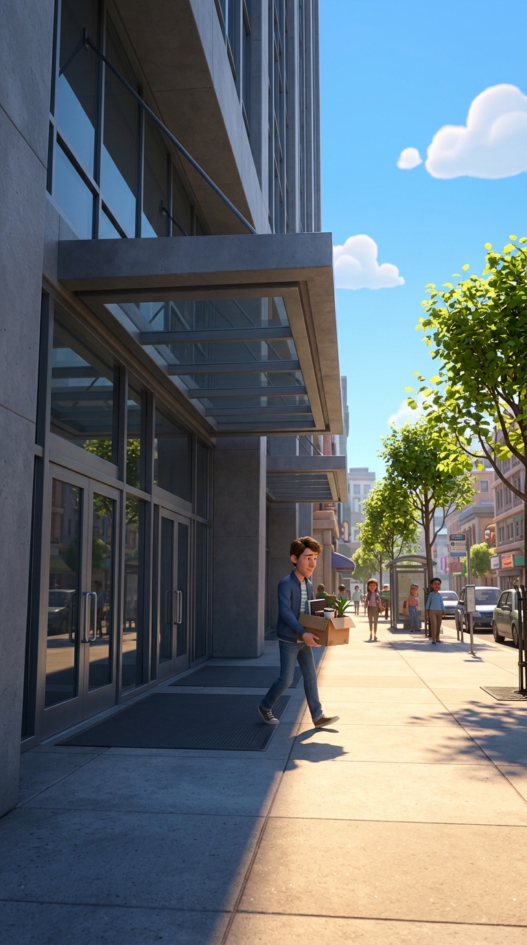 Камера статична. Двери автоматически открываются. Кевин выходит медленно, почти торжественно. Контраст между темным офисом внутри и ярким...