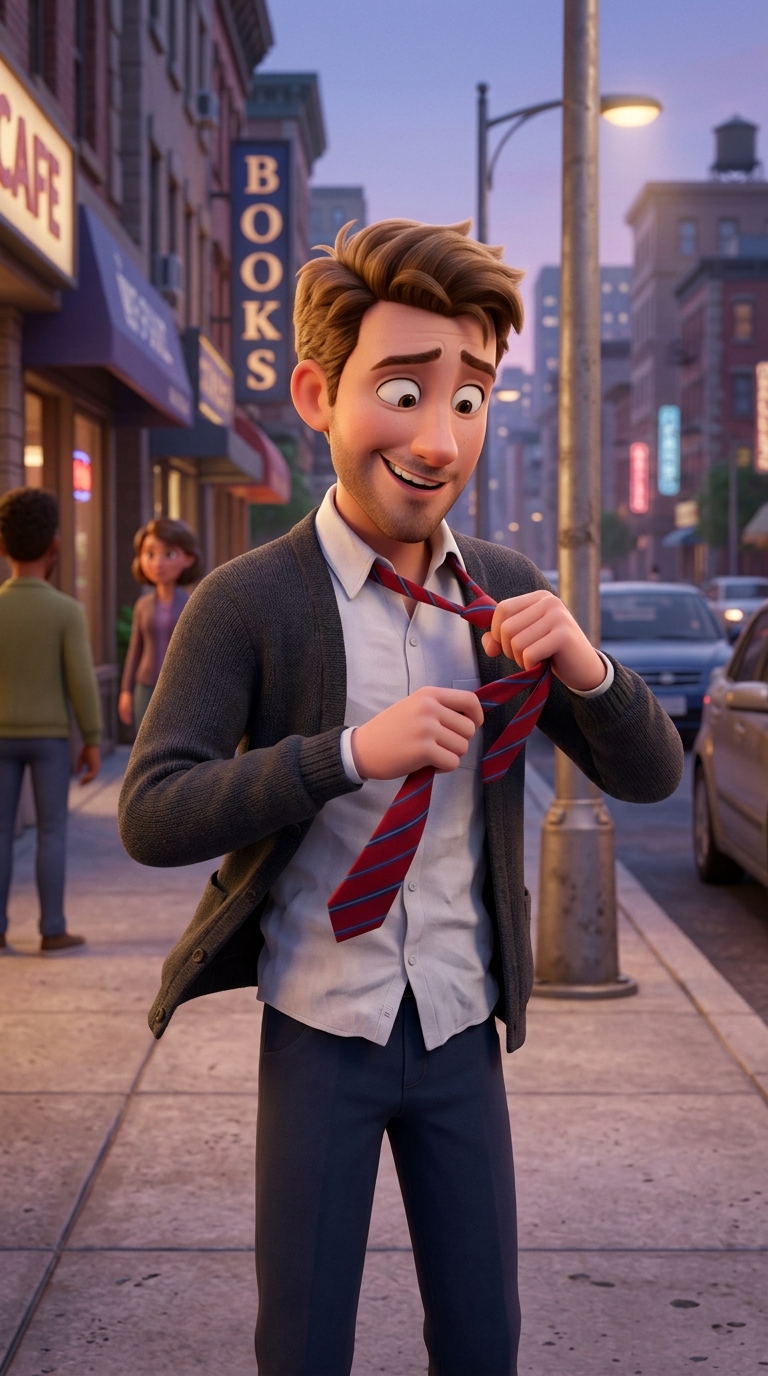 Средний план. Кевин стоит на тротуаре, смотрит на свой галстук, затем реш...