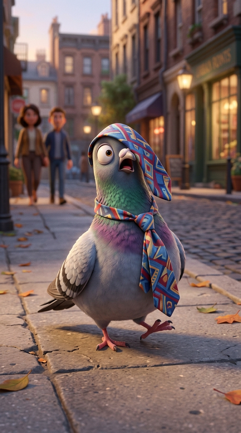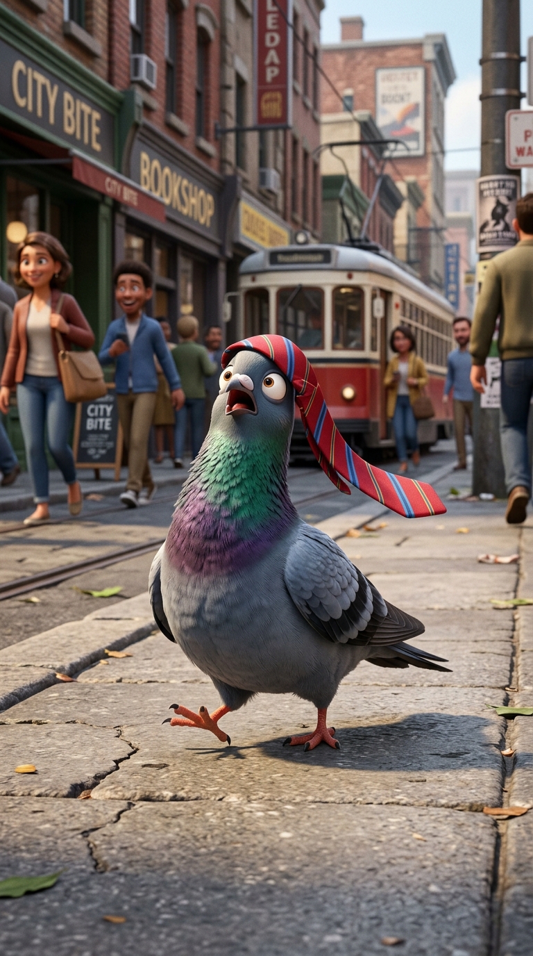 Галстук приземляется на голову удивленного городского голубя, который важ...