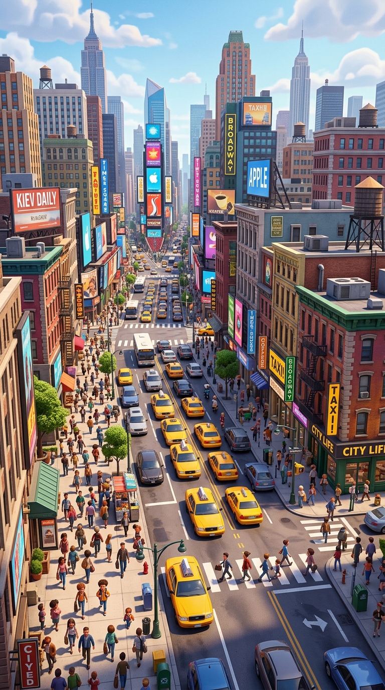 Панорамный вид оживленной городской улицы с высоты. Желтые такси, спешащи...