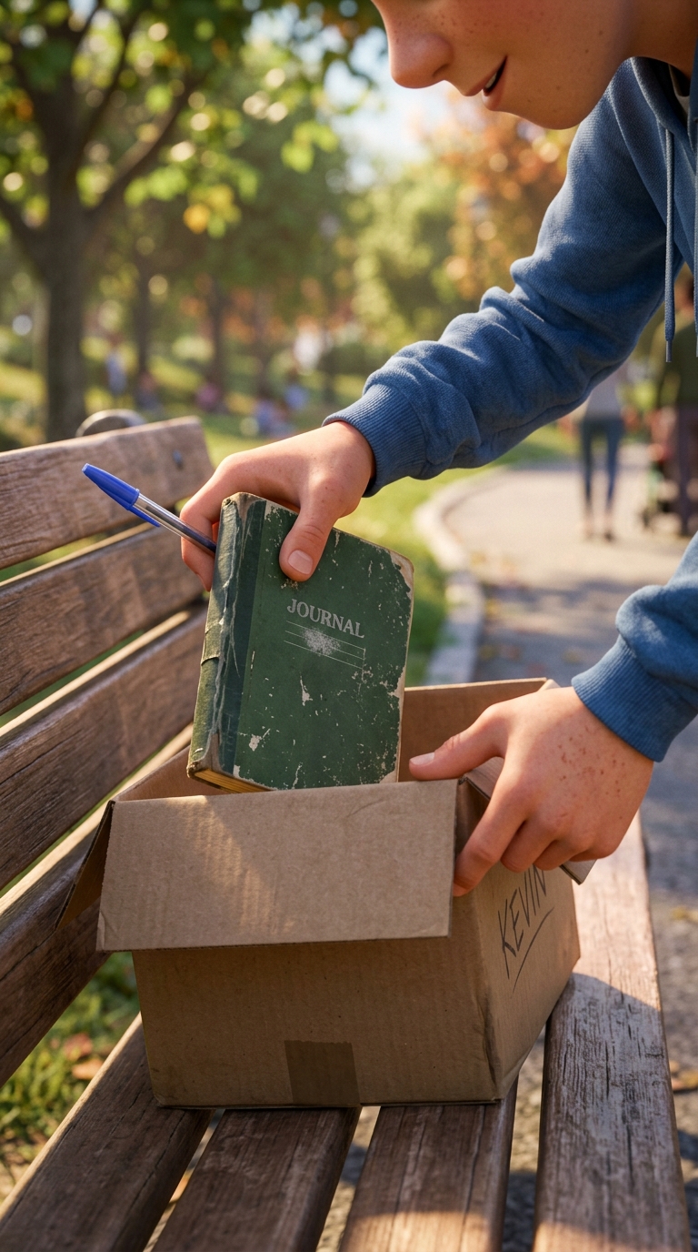 Крупный план на руки Кевина. Он ставит коробку на скамейку в парке и дост...